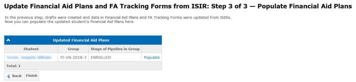 The third step allows populating the updated FA Plans by clicking the Populate link at the Updated Financial Aid Plans panel: