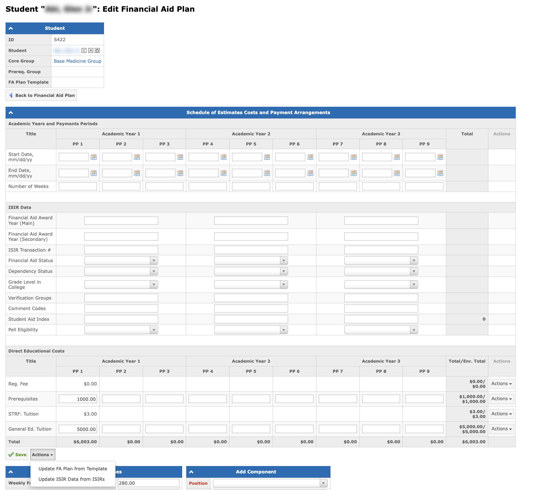 - The Financial Aid Plan can be updated on the Student "Name": Edit Financial Aid Plan by clicking the Update ISIR Data from ISIRs button in the Actions drop-down menu: