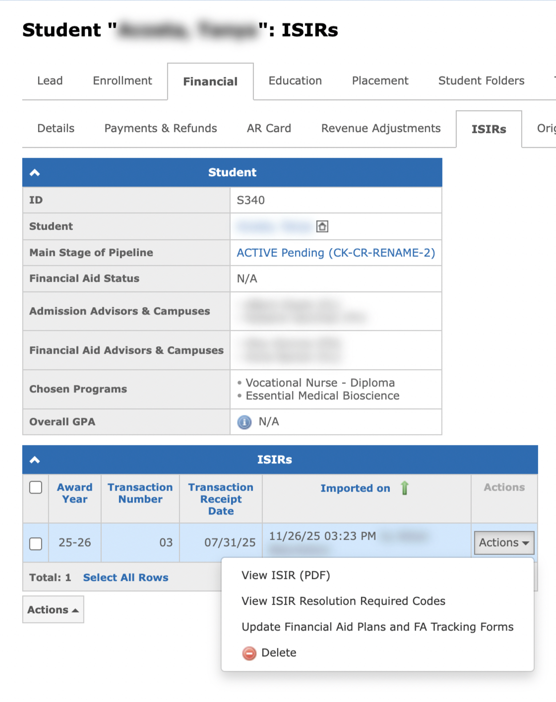 - Open the Student "Name": ISIRs page and click the Update Financial Aid Plans and FA Tracking Forms action to update the student's data individually: