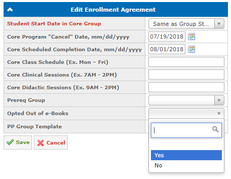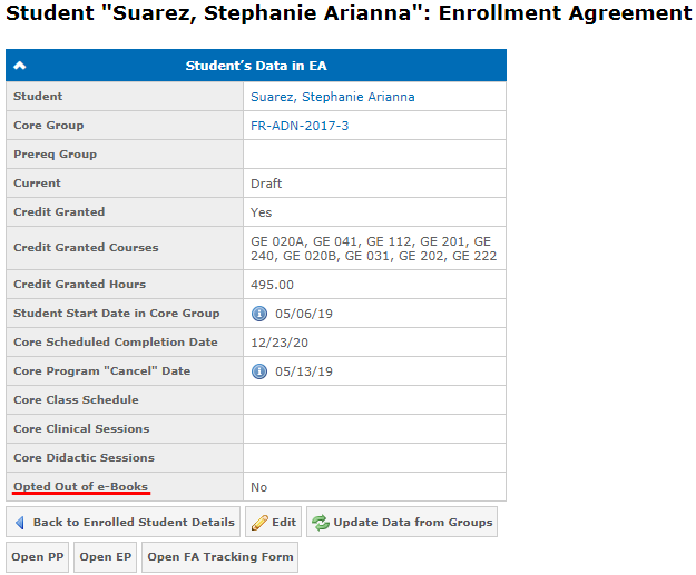 The Student "Name": Enrollment Agreement page now has the Opted Out of e-Books field with Yes and No options.
