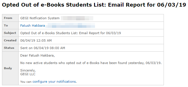 An email with the subject List of Opted Out Students, containing a list of active students with Yes selected in the Opted Out of e-Books field, is sent each Monday at 8:00 AM by default.