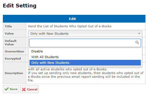 Sending emails may be disabled or switched to the new students only at the Send List of Students Who Opted Out of e-Books setting at the School Settings page. The default value is Only with New Students:
