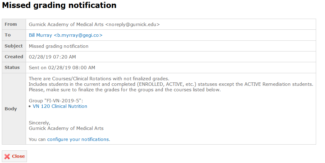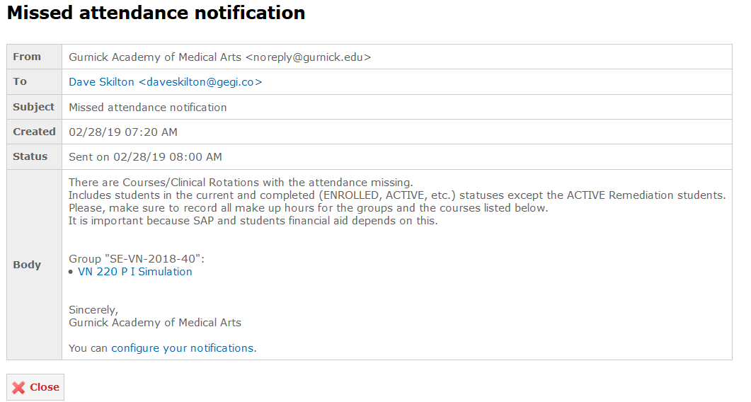 The notifications about missing attendance or grades are sent about students in the ACTIVE Remediation stage that are finishing/retaking some courses at the moment.
