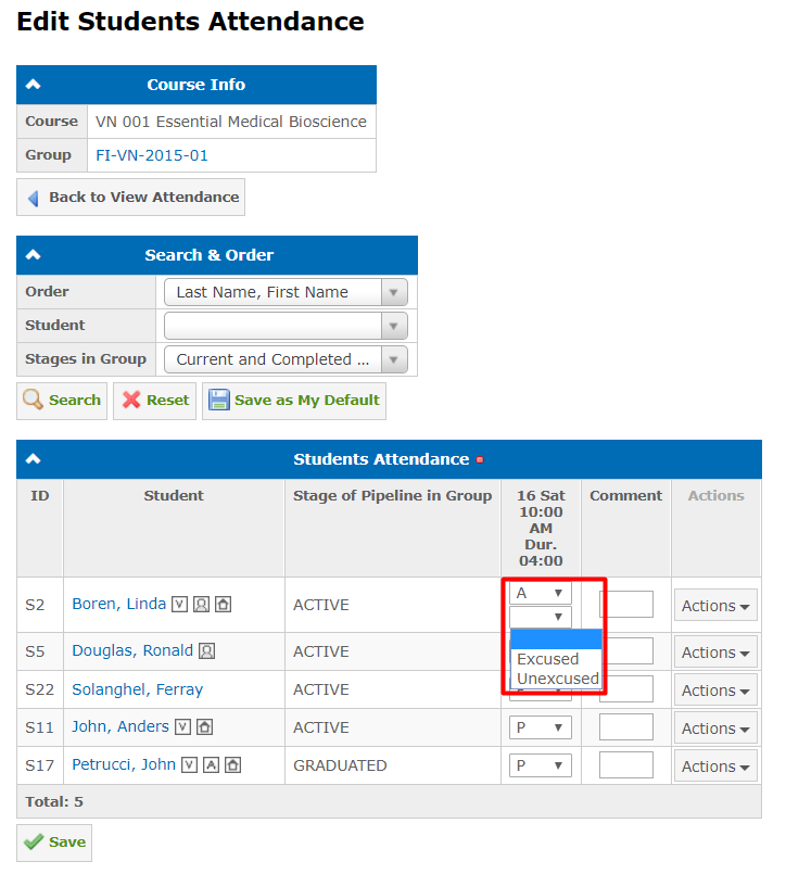 - Education → Clinical Attendance → Edit Students Clinical Attendance