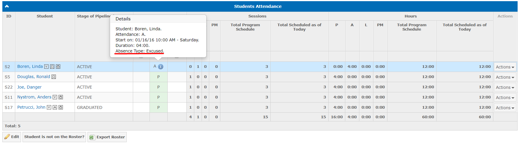 The absence type is shown as well when viewing students attendance, attendance reports in GEGI, and in the PDF versions of documents. Most pages show the attendance as follows: A/PM (Absence Type):