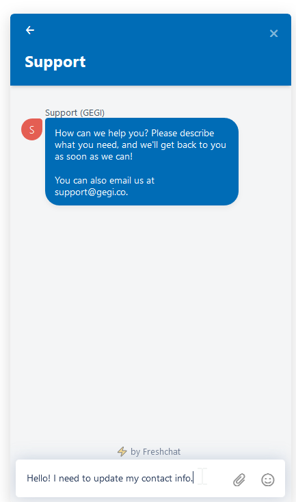 You can also contact GEGI Support using Freshchat. Click the chat icon in the lower right corner to open it: