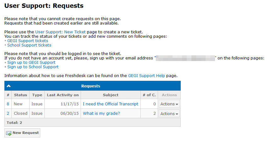 The User Support: Requests page shows all tickets that you created. On this same tab, you can see the New Request button. Click the button to open the ticket creation page:
