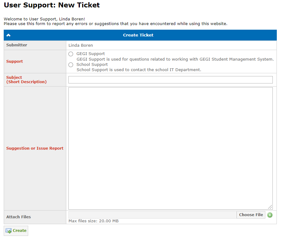 - Support – select the type of Support Service (GEGI Support or School Support).