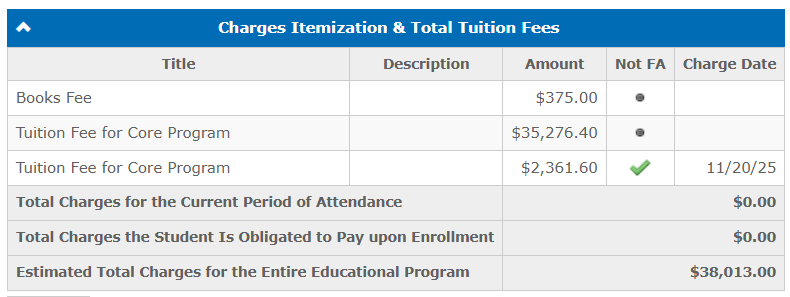 - Courses assigned to a "Tuition Fee" charge in "Charges Itemization & Total Tuition Fees" with Not FA checkmarked: