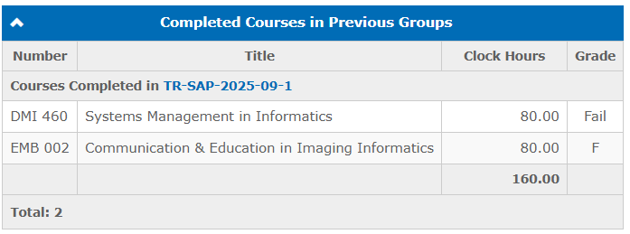 Each course has the Credit Hours Total field with the expected credit hours. If the course gets to SAP, the Credit Hours field will show the total hours at the course end: