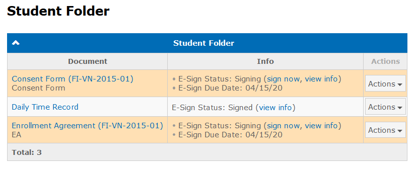 To proceed to document signing click the sign now link in the information message or on the Student Folder page in the corresponding document row: