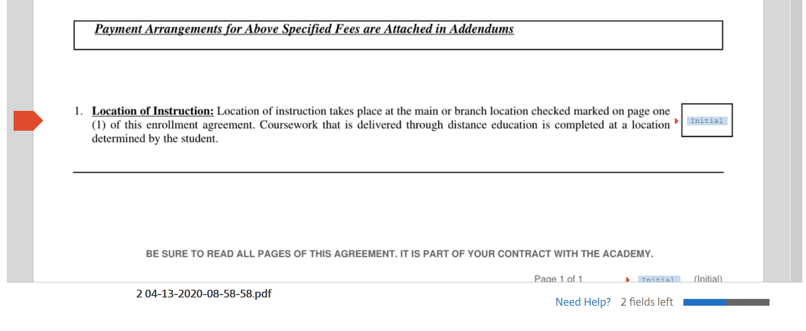 Note: A red icon at the left margin will mark all the empty required fields. The text in the field will prompt you what information should be entered (signature, date, initials, and so on). Also, you will see the progress bar in the bottom right corner showing how many fields left and how many are to be filled:
