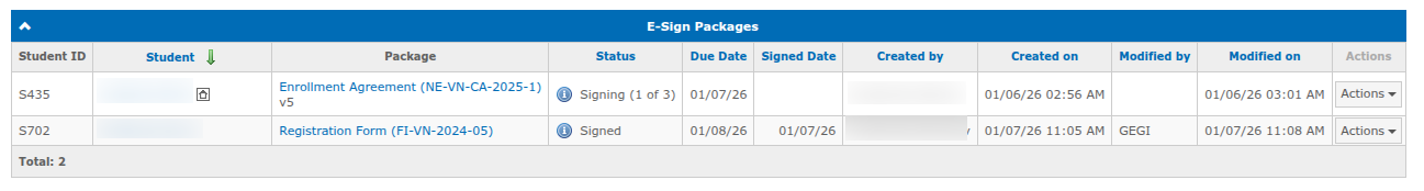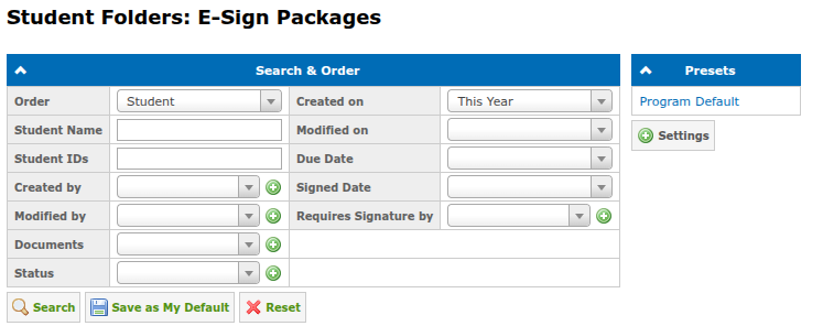 The list of all e-sign packages can be found at the Student Folders: E-Sign Packages page located at the Student Folders menu tab.