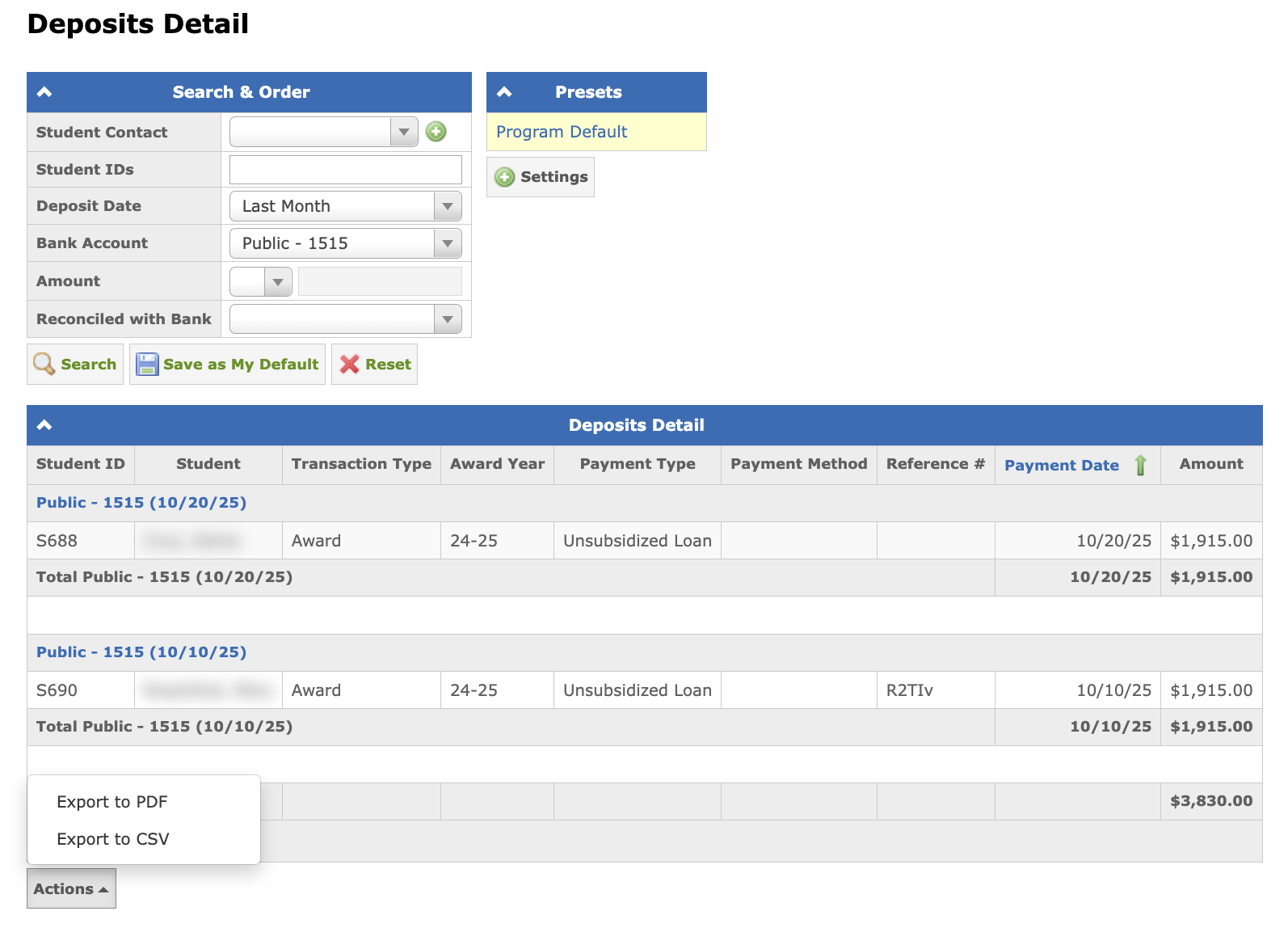 - Payment details: Student, Transaction Type, Award Year (for awards), Payment Type, Payment Method, Reference #, Date, Amount.