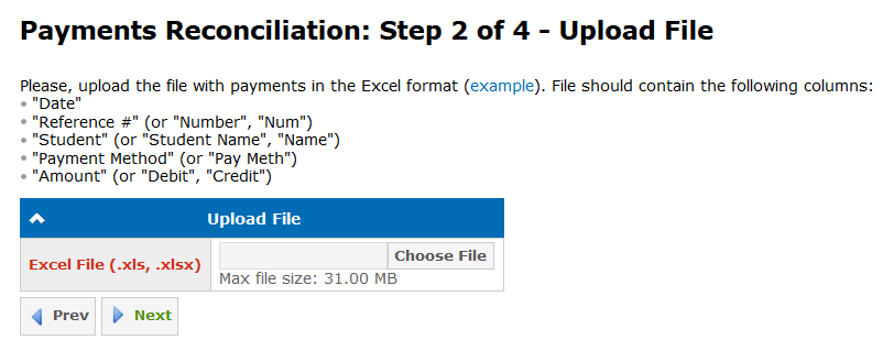 At the second step, Payments Reconciliation: Step 2 of 4 - Upload File, you need to upload an XLSX (XLS) file with a certain set of columns (explained in the hint) and with the data entered: