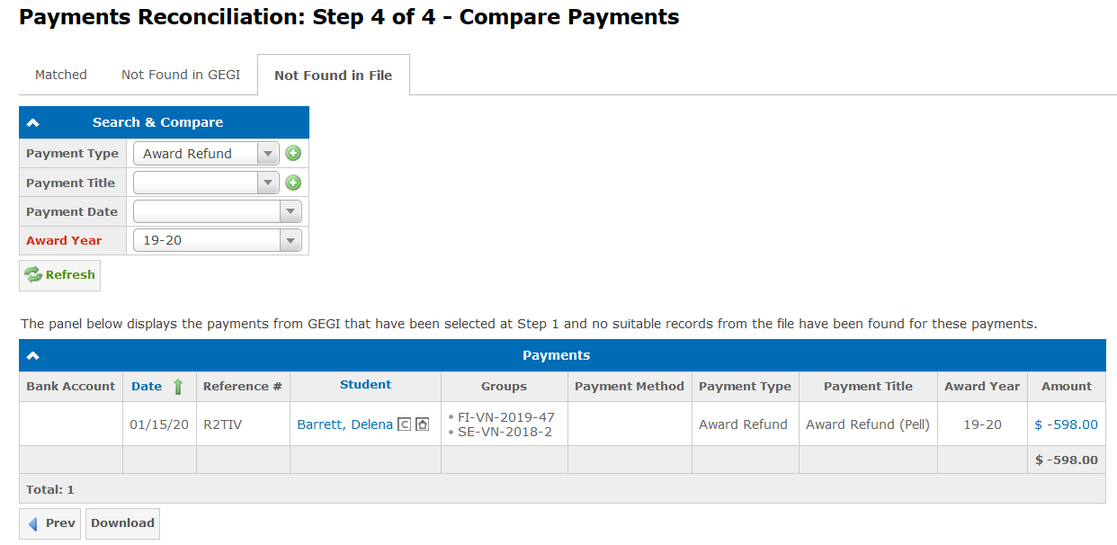 - Not Found in File - the payments that are found in GEGI by the selected filters but are missing in the file:
