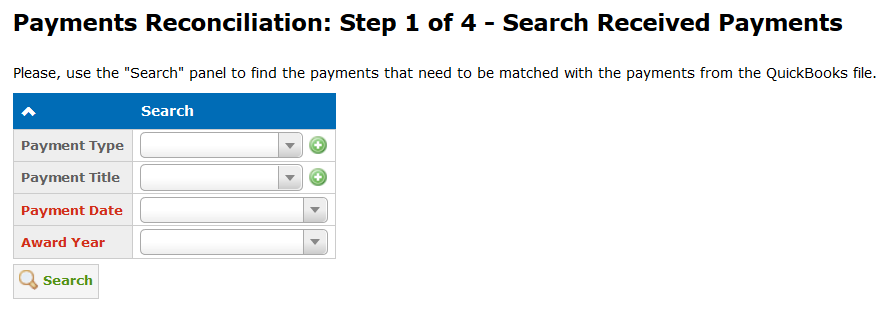 At the first step, Payments Reconciliation: Step 1 of 4 - Search Received Payments, fill in the provided fields:
