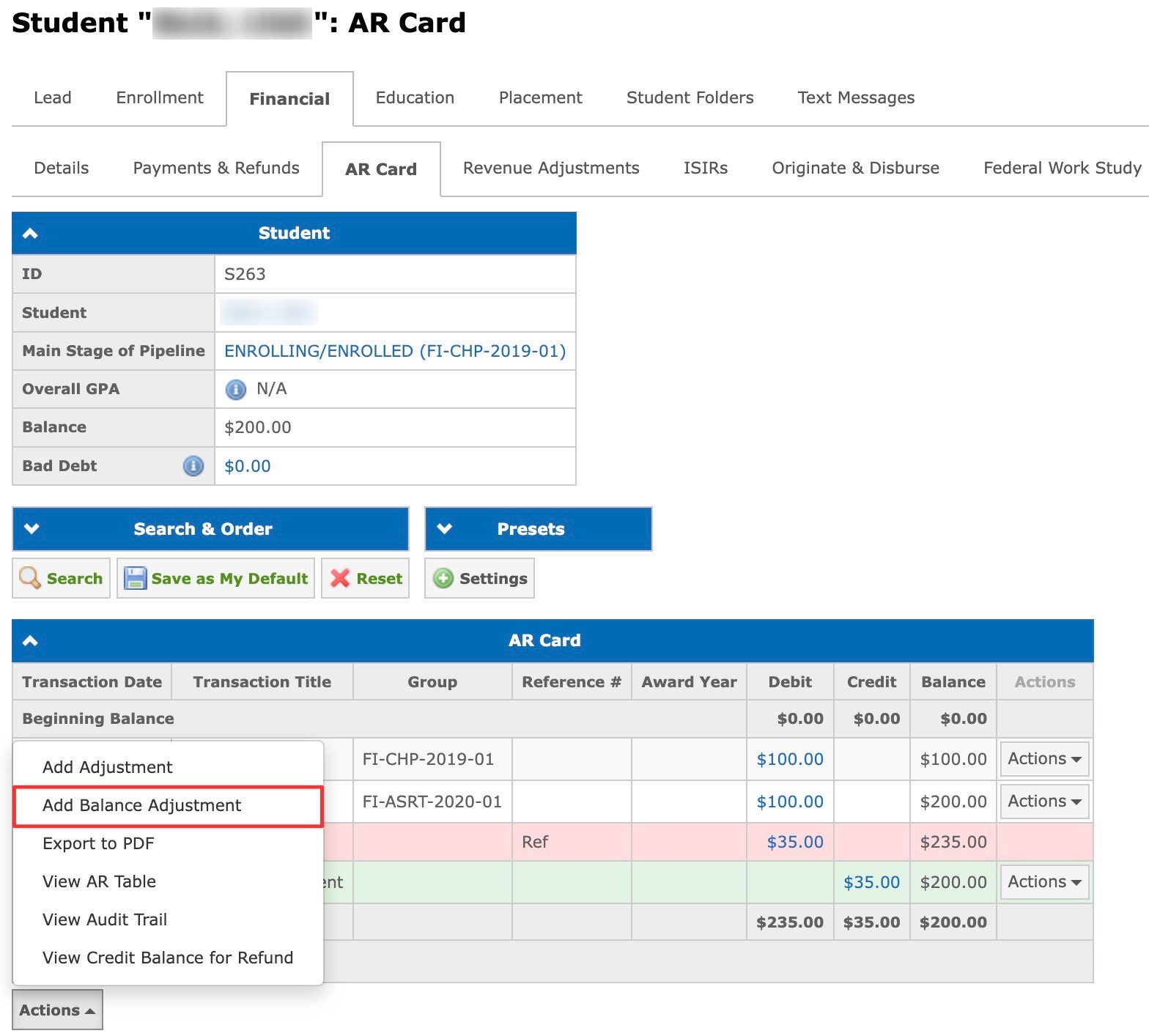 Balance adjustments can be added in the AR Card of a student using the Add Balance Adjustment item in the Actions drop-down menu:
