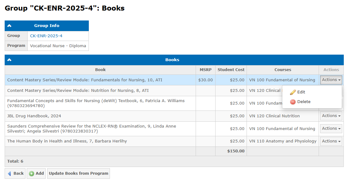 When creating the Enrollment Agreement for a student, the books list is updated according to the student’s assigned courses.