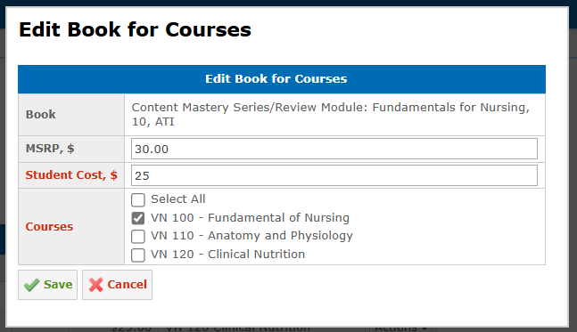 Select a book from the list of the books, fill in Student’s Cost, and select the courses the book relates to: