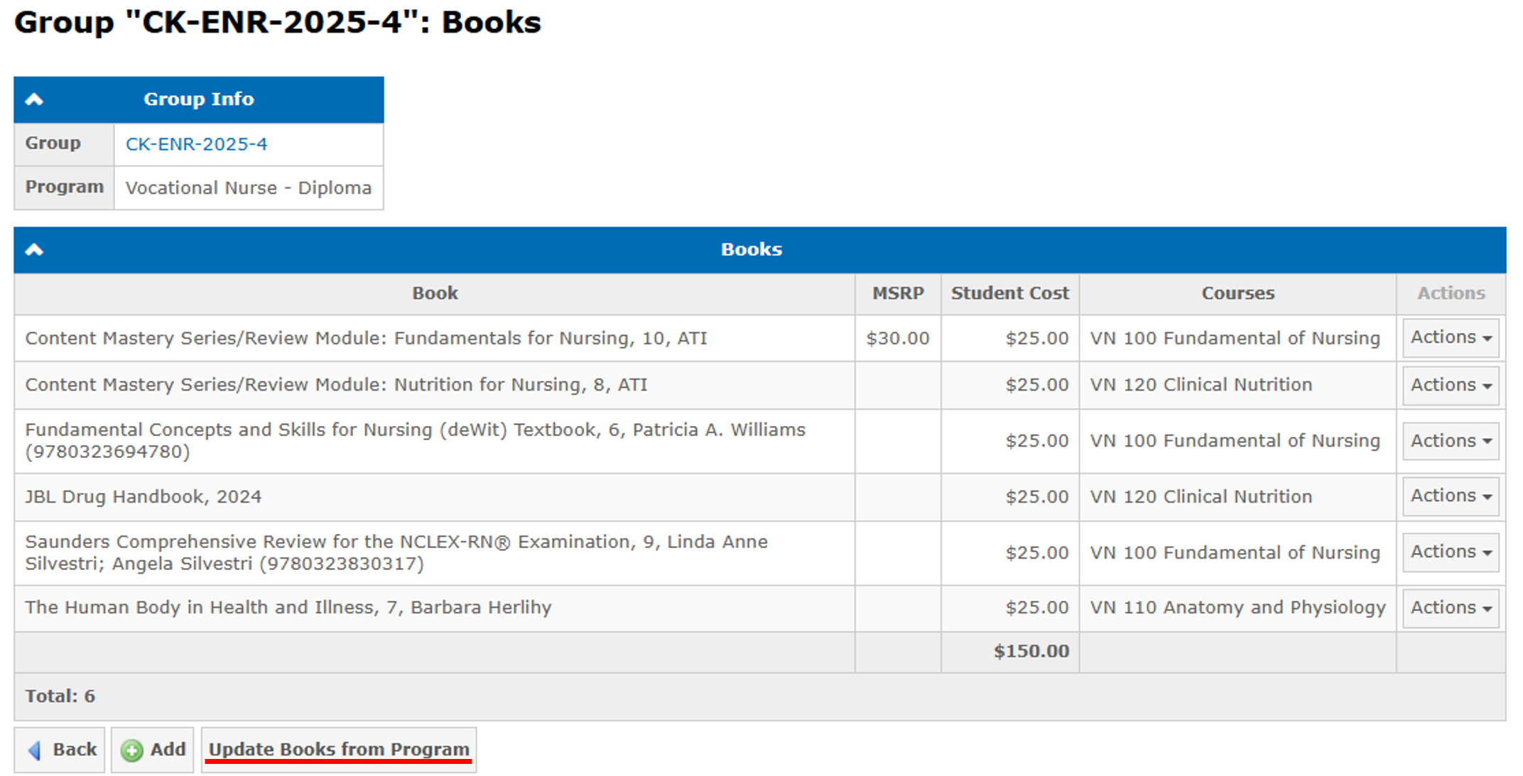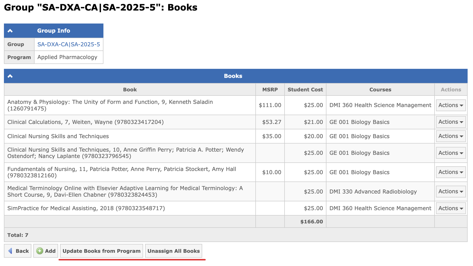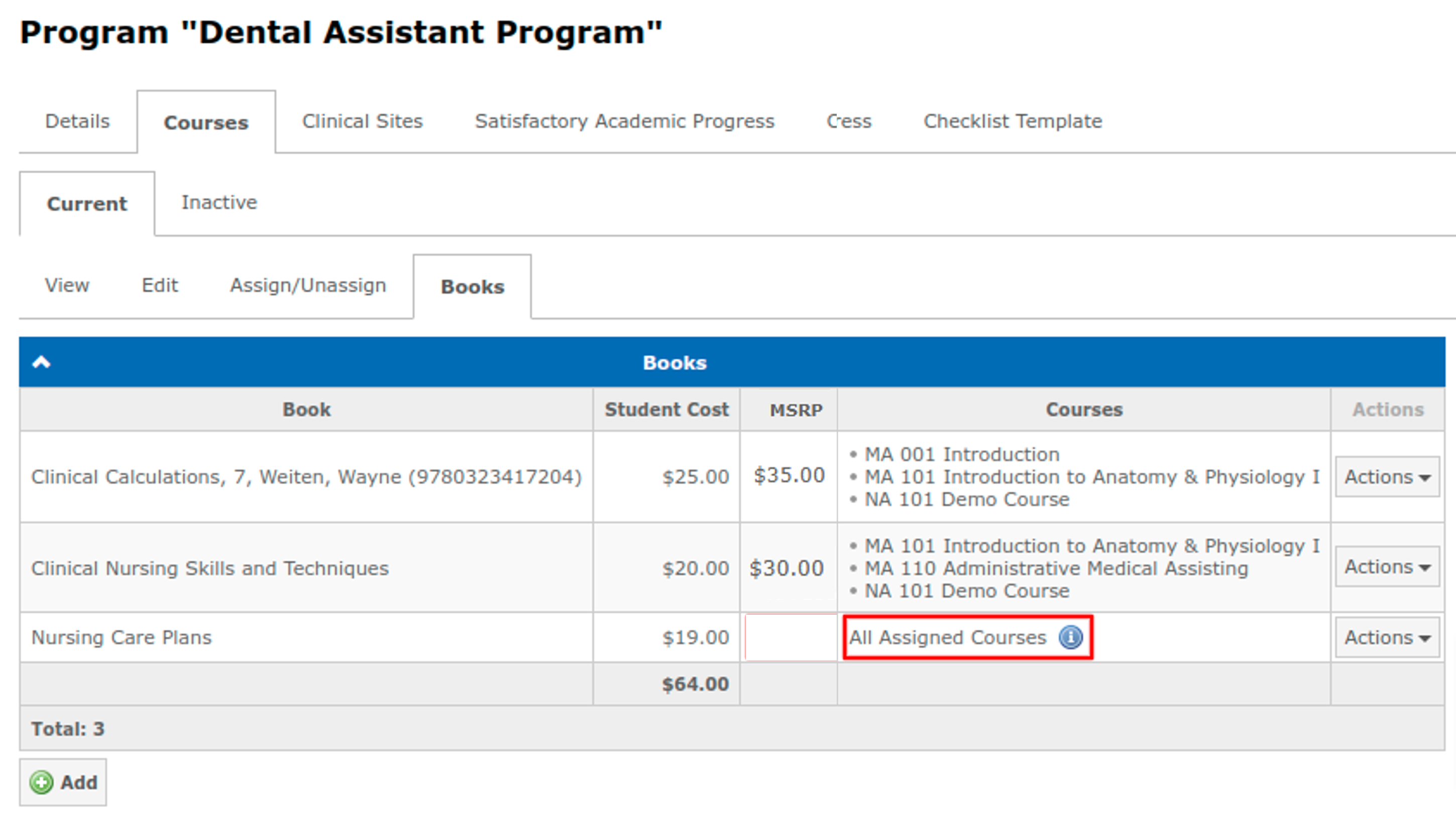 The program books list is configured here: Program → Courses → Books. If a book has all program courses selected, you will see "All Assigned Courses" in the Courses column: