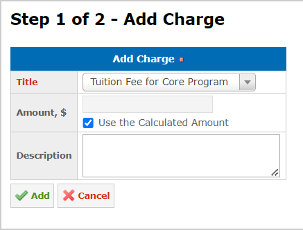 Some charge types, like the Tuition Fee and the Books Fee, support automatic amount calculation. The Tuition Fee is calculated based on the course hour cost and the total course hours in a group. The Books Fee is calculated using the cost of the group books: