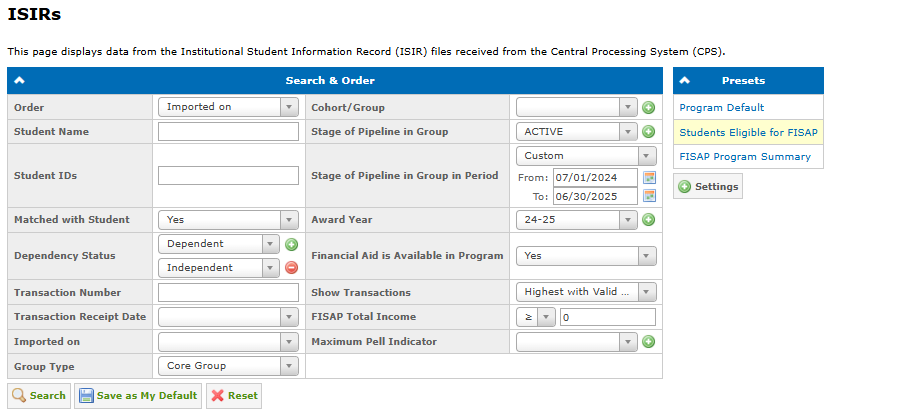 2. Click the Students Eligible for FISAP preset: