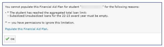 The Financial Aid plan will not be populated if a student exceeds the aggregated limit for a Direct Loan (only for Subsidized or Total (Subsidized+Unsubsidized)). The limit is validated using the information from the student’s last ISIR file.