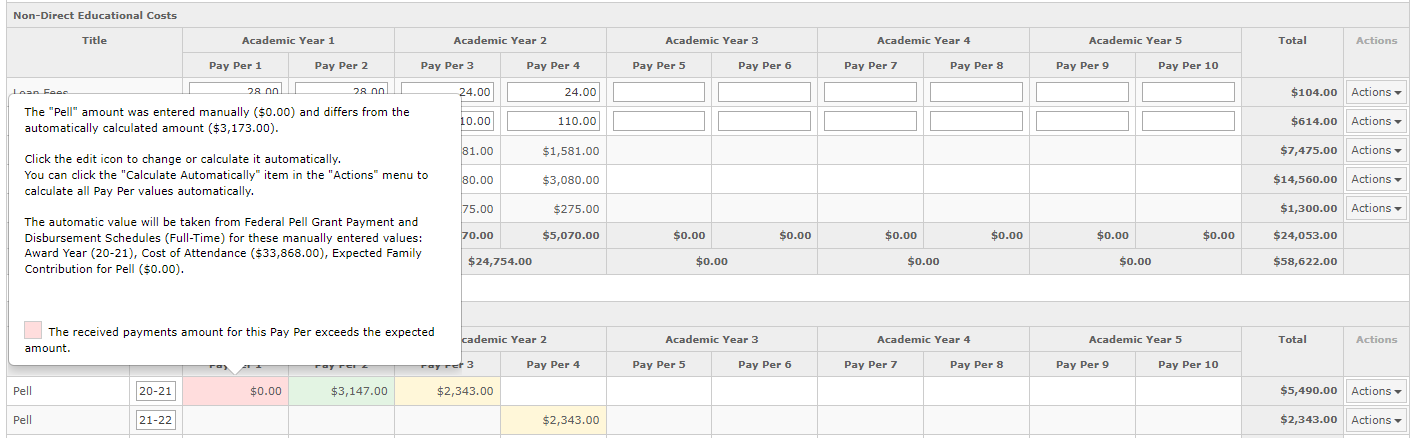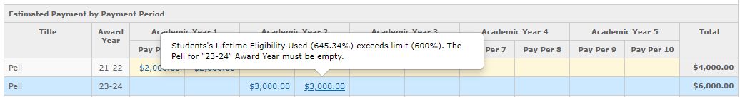 If the student has reached or exceeded this limit, Pell should not be paid. The Pell rows in the student’s Financial Aid plan will be highlighted in yellow and hovering over the row will show the corresponding information: