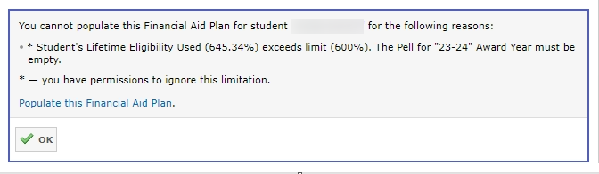 The Financial Aid plan populating is restricted when a student’s Lifetime Eligibility Used (LEU) has reached or exceeded the limit (600%).
