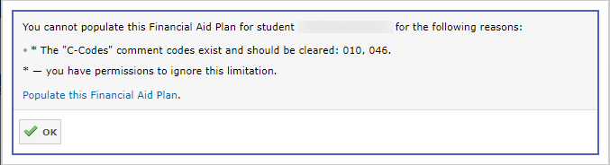 You will also see a message about the inability to populate the Financial Aid plan if it has any C-Codes: