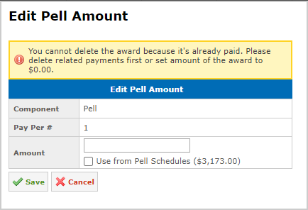 When editing awards that were paid, the system will not allow deleting such awards from the Financial Aid plan and only allows setting the amount to 0: