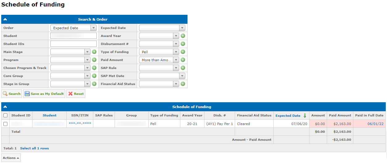 After the Financial Aid plan is populated, this award and the payment will be also highlighted in red in the Schedule of Funding report (Financial Aid → Award Reports → Schedule of Funding):