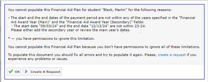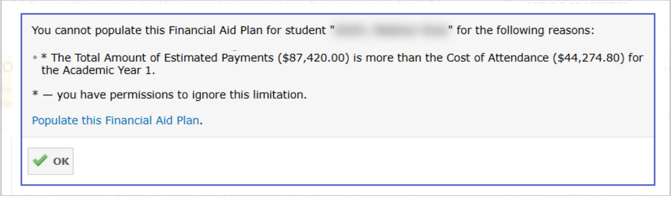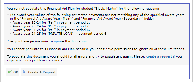 After creating the draft Financial Aid Plan, the system validates the entered information and can block the Financial Aid plan from being populated in some cases.