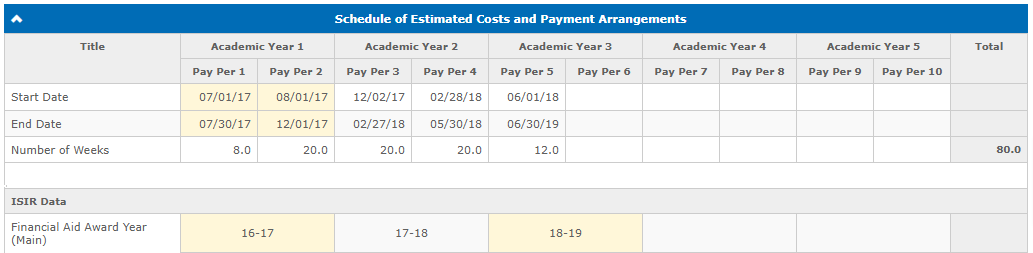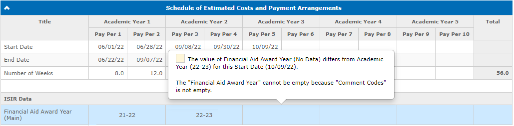 - Award years defined in the Estimated Payments by Payment Period section should correspond to one of the award years from the Financial Aid Award Year (Main) or the Financial Aid Award Year (Secondary) field. Otherwise, the restrictions apply: