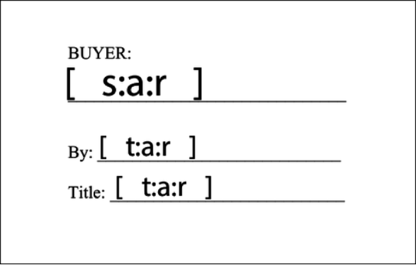 The tags added to a document are colored in the background color so they are not visible when viewing a template. A signature tag is added within square brackets "[ ]". The contents between brackets are formatted as follows:
