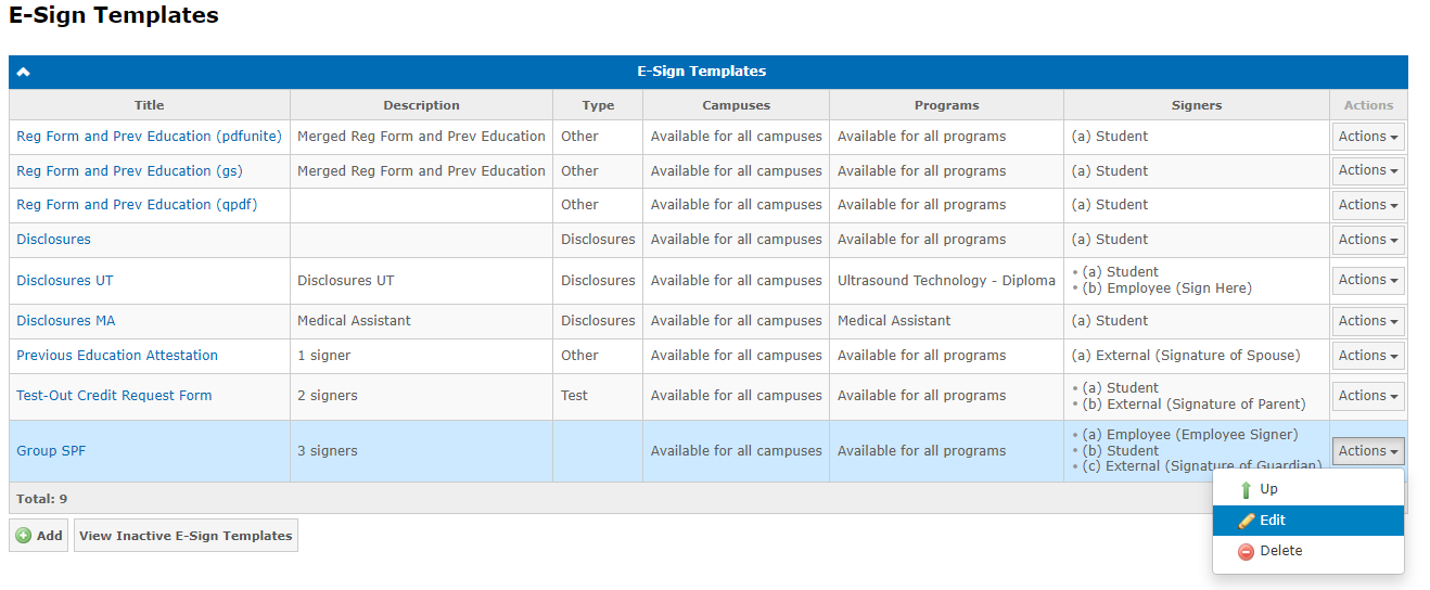 You can edit an e-sign template at any time using the Admin Student Folders & Templates → E-sign Templates page and the Actions → Edit in the corresponding template row: