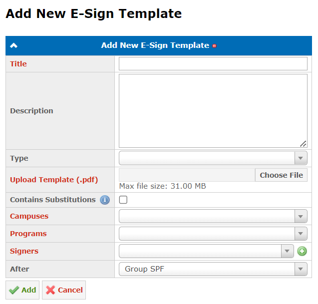 Upload a document by going to Admin → Student Folders & Templates → E-sign Templates and clicking Add: