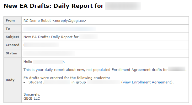 Now, when a student has a new draft Enrollment Agreement created from the previously populated version, the information about such drafts is collected and the corresponding users get a daily email notification: