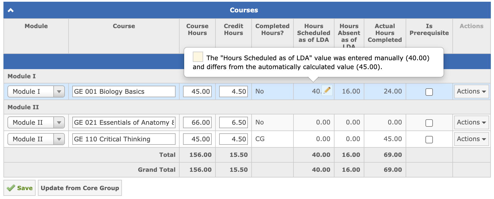 Note: Values for the Hours Scheduled as of LDA and Hours Absent as of LDA columns are calculated automatically, taking into account hours in the classes scheduled up until the date of LDA.