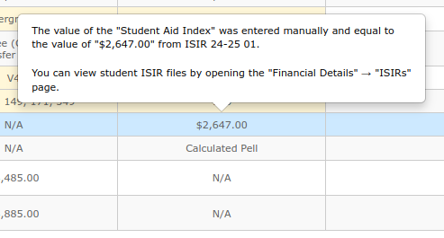 Student Aid Index (SAI) and Pell Eligibility can also be edited starting from award year 2024-2025. Earlier years cells will show "N/A".