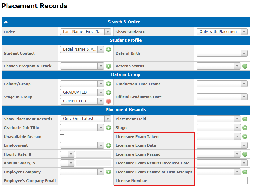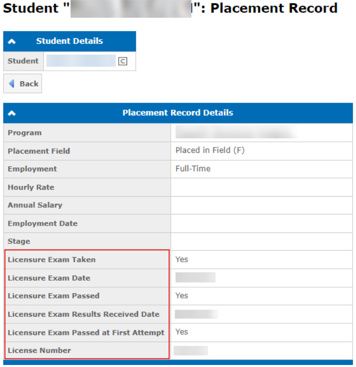 Programs with licensure exams in the placement record will have the following fields: