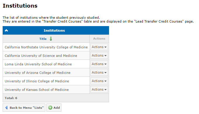 The Institution and the Course field values are taken from the list of values the school provides and maintains. The lists can be edited on the Admin → Lists → Institutions page, and editing it requires the Manage Institutions and the Manage Transfer Credit Courses permissions: