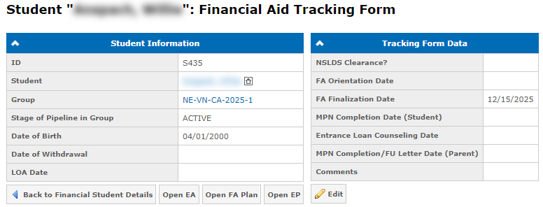 The FA Tracking Form contains data used to determine whether a student is ready to receive Financial Aid. The form is accessible from the student’s FA Plan. You can switch between the Enrollment Agreement, FA Plan, and FA Tracking Form using the buttons at the top of the page.