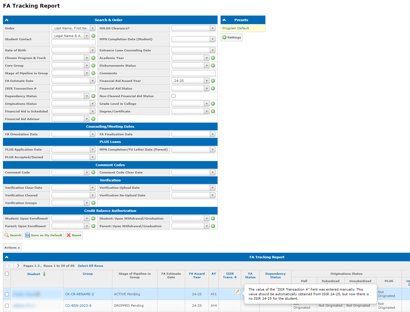 Information in the FA Tracking Form can be filled in manually or using student’s ISIR from Student "Name": ISIRs page: