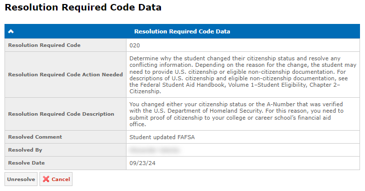 Note: After a new ISIR transaction, the system checks for blocking codes again. If the system finds a previously resolved code, it will be marked unresolved, because a student should not receive resolved codes in their ISIR.