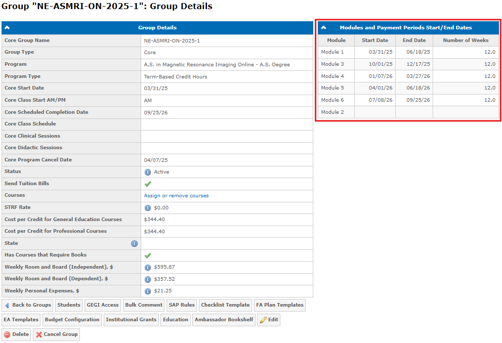For term-based credit hour programs, use the Modules and Payment Periods Start/End Dates table in Group Details to set dates and weeks for each payment period: