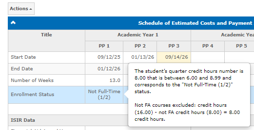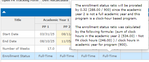 The enrollment status is always Full-Time for clock hour programs. For partial academic years, GEGI displays the ratio of clock hours in the academic year to full academic year hours.