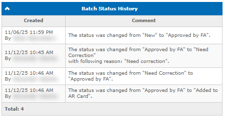 - Accounting review: after FA users approve the batch, accounting users review it and either process or return it to the FA. The Decline button returns batches to the FA with the Need Correction status. The Add Award button processes the batch and creates AR Card transactions.