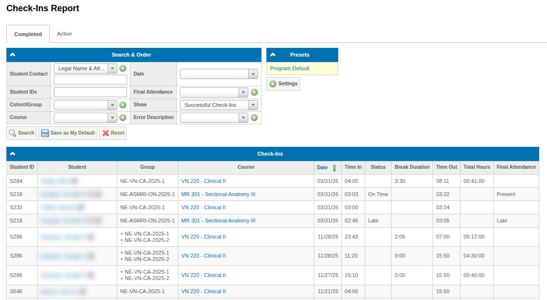 The Check-Ins Report displays check-in/check-out data with detailed time tracking and is organized into two tabs: Completed and Active. The report is available in the Education → Education Reports menu:
